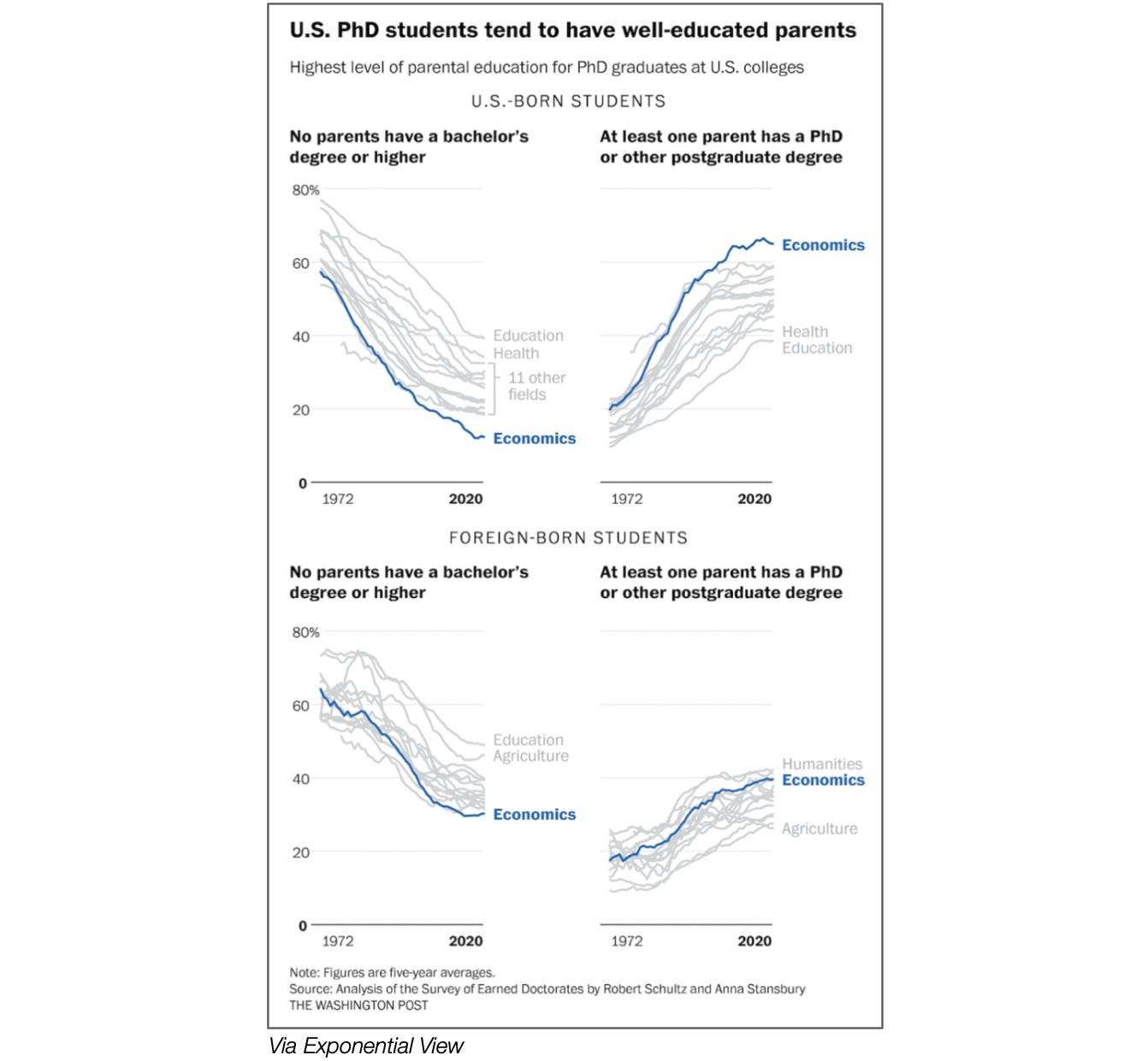 The (sort of) bad news: People from elite backgrounds increasingly dominate academia, data shows. First-generation academics were always rare. Now they’re vanishing. This is particularly pronounced in economics. Two-thirds of U.S.-born Ph.D. graduates in economics have a parent with a graduate degree. Fifty years ago, that number was only about 20%, suggesting increasing difficulty for first-generation graduate students.